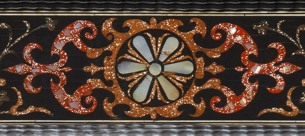 This mirror is a magnificent example of how pieces of art were influenced by other cultures : The design of the inlay is influenced by the French Boulle marquetry (or vice-versa ???), the mother-of-pearl-inlay are influenced by the famous Japanese namban decoration. The mother-of-pearl rosaces are stylised representations of the flower Dianthus chinensis (Chinese carnation) often represented in the namban decoration which stands for “Flower of the Gods” and symbolizes admiration, passion, capriciousness, affection, love and gratitude.