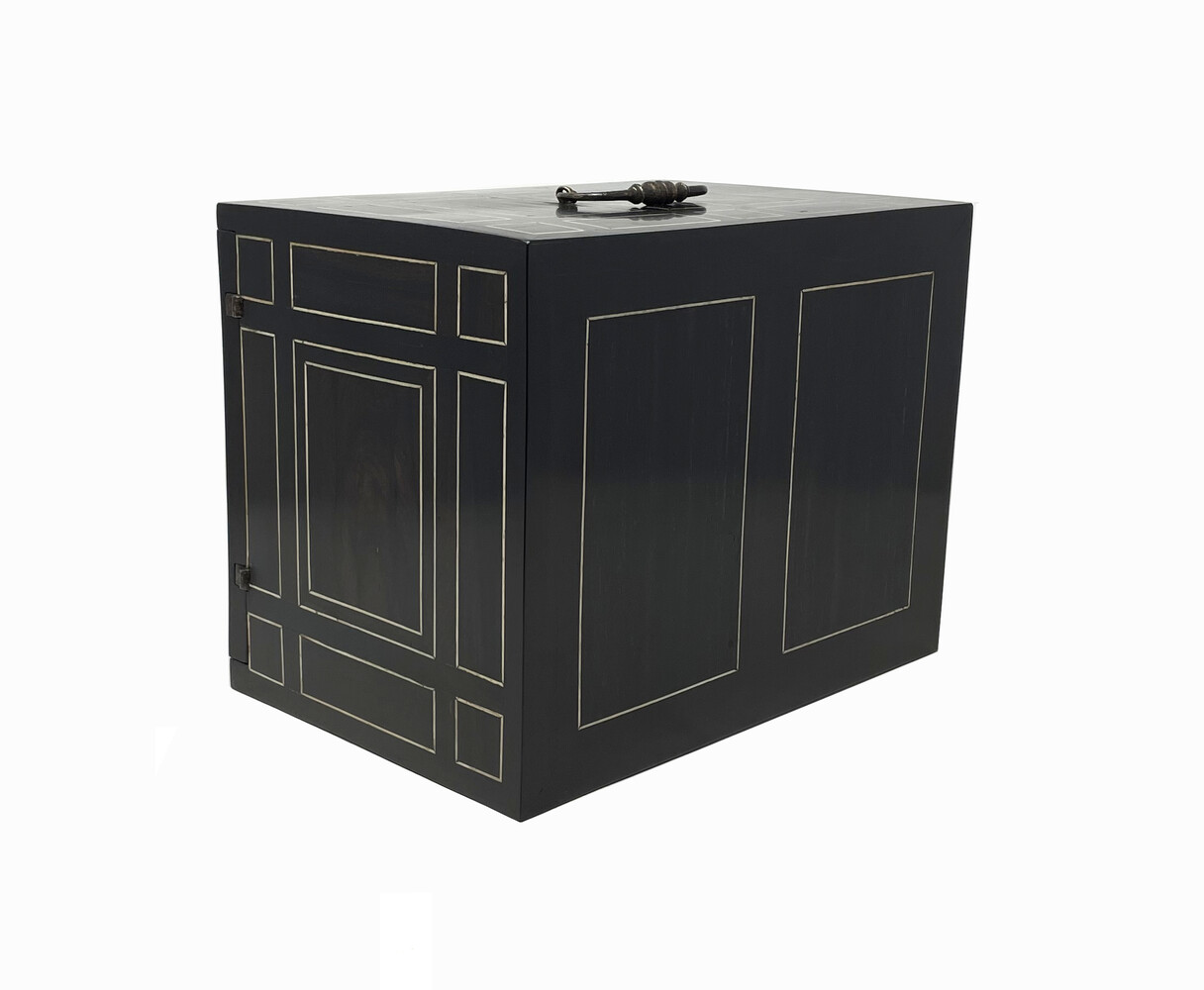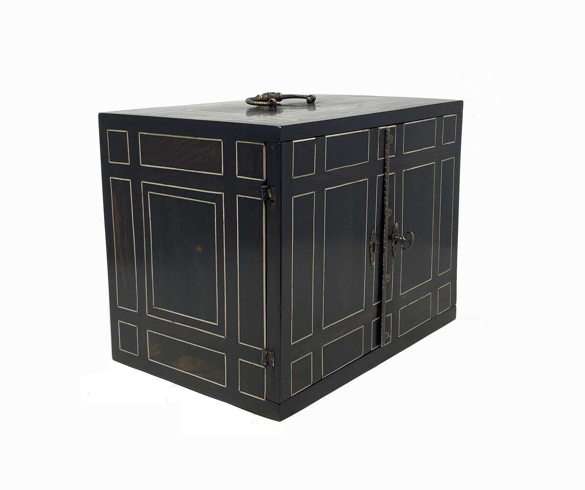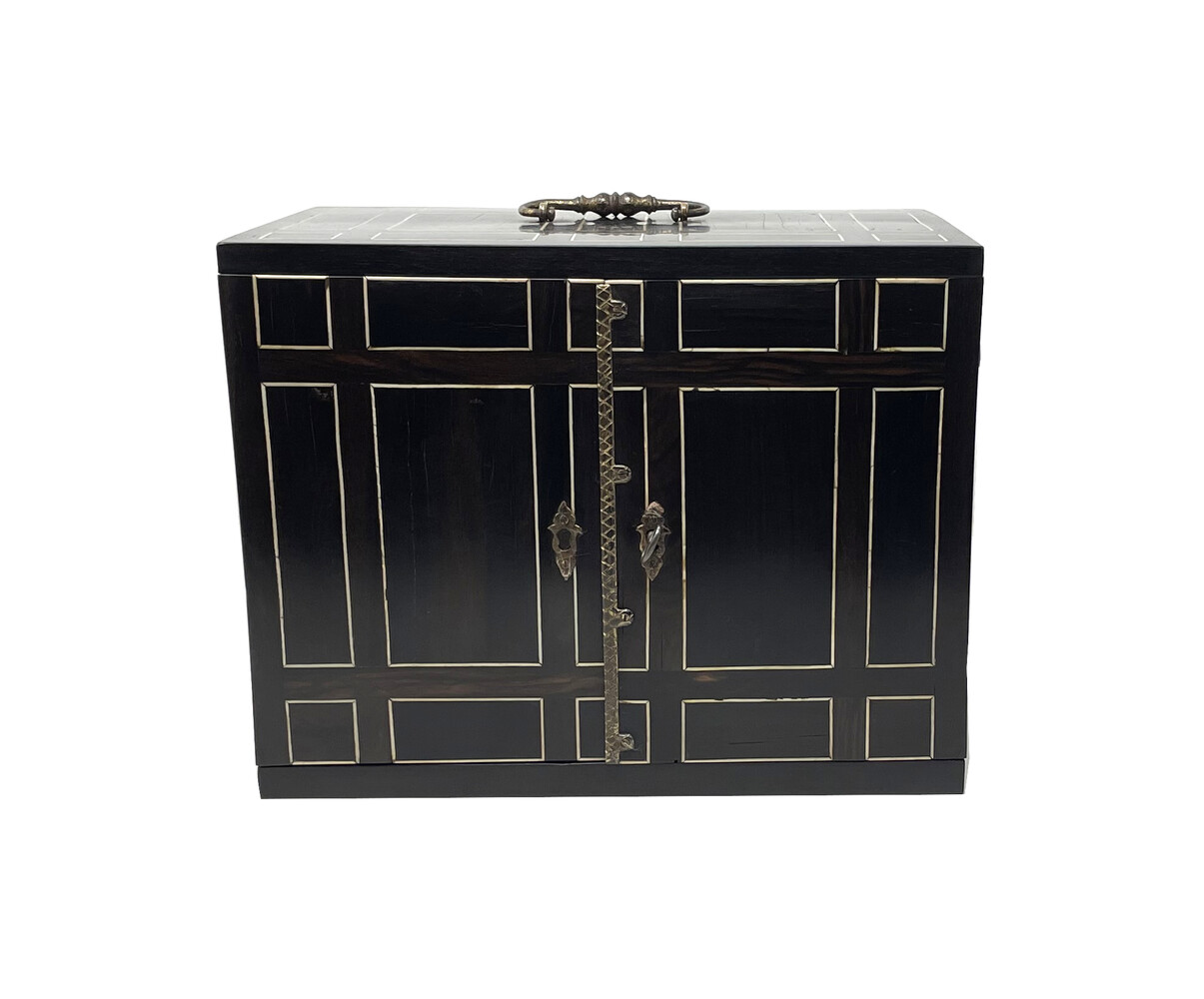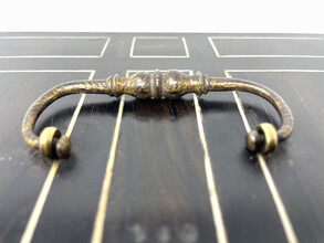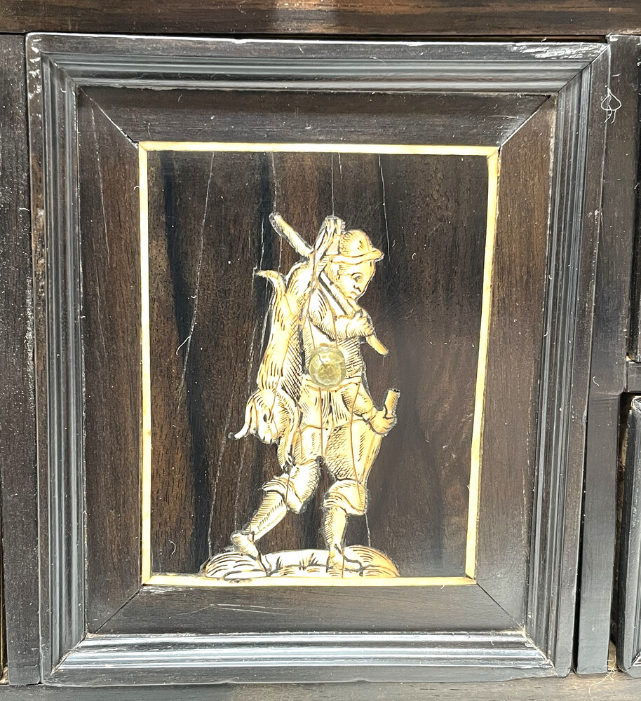 Veneered with ebony and bone hunted animals and a hunter ; with geometric bone-stringing patterns on the outside,