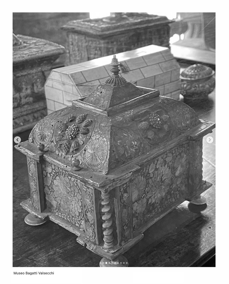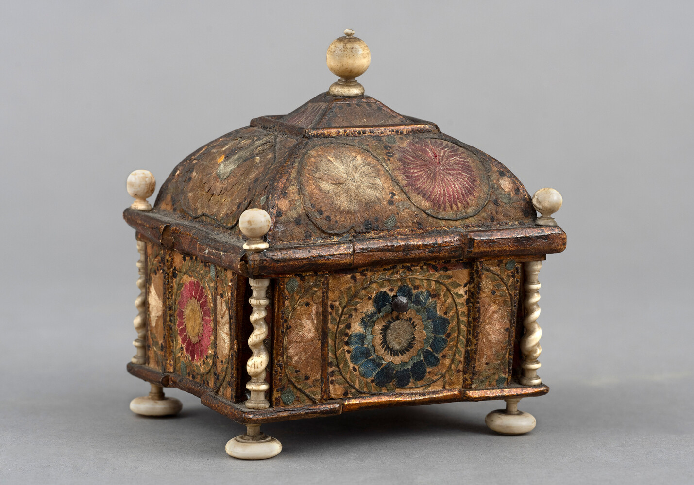 A rare lovely small German jewelry casket, with a domed lid, all decorated with stained straw in geometric and floral patterns, flanked by turned bone pilasters ; on four bone feet.