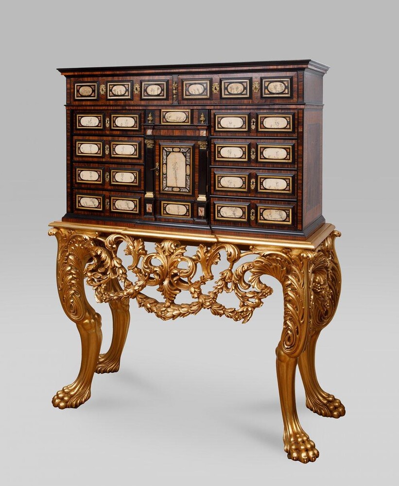 A Charles II pietra dura-inlaid padouk, kingwood and ebony cabinet-on-stand. The pietra dura panels originating from Florence, 17th century. The cabinet circa 1690, the gilded stand modern.