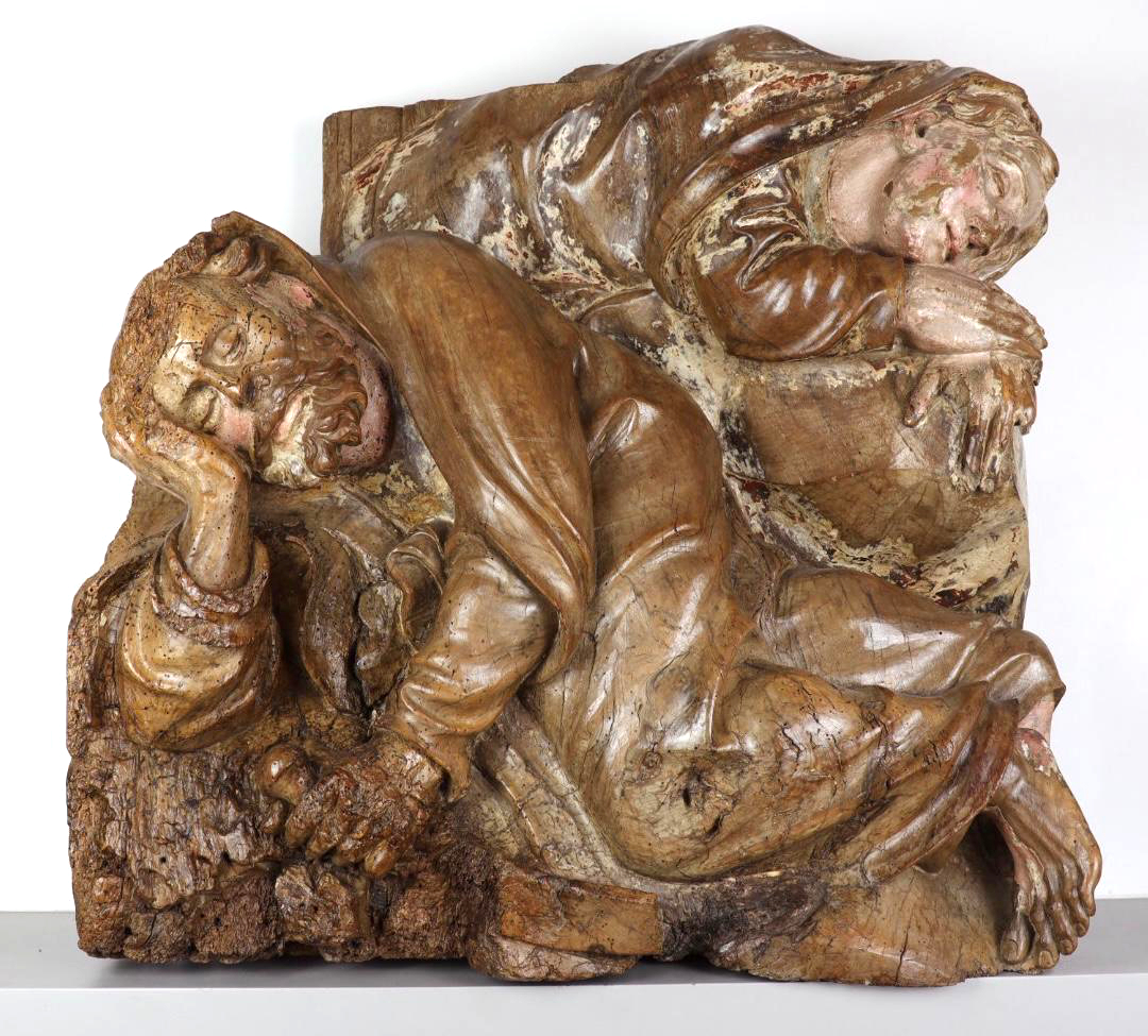 AN IMPORTANT GERMAN GROUP A German carved walnut group depicting Jesus disciples the sleeping Saint Peter and Saint John.