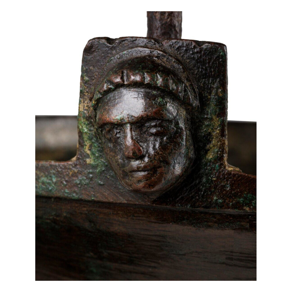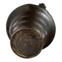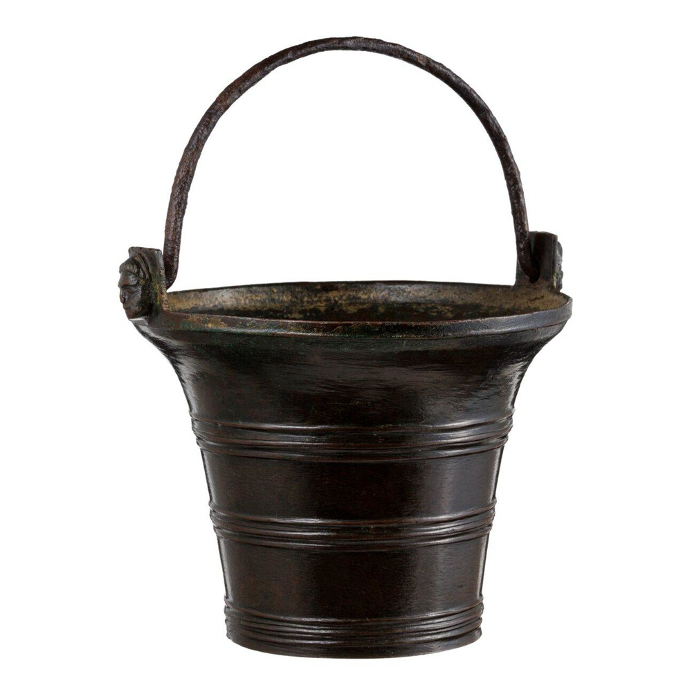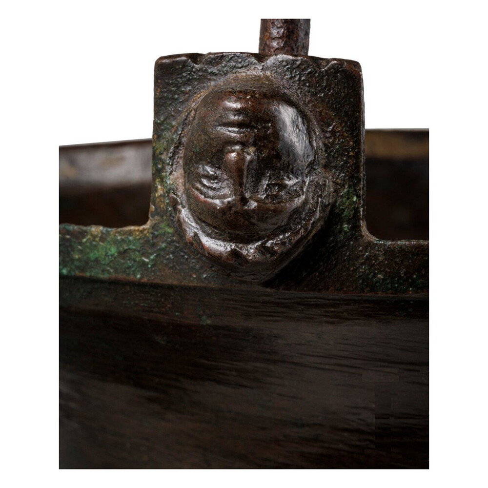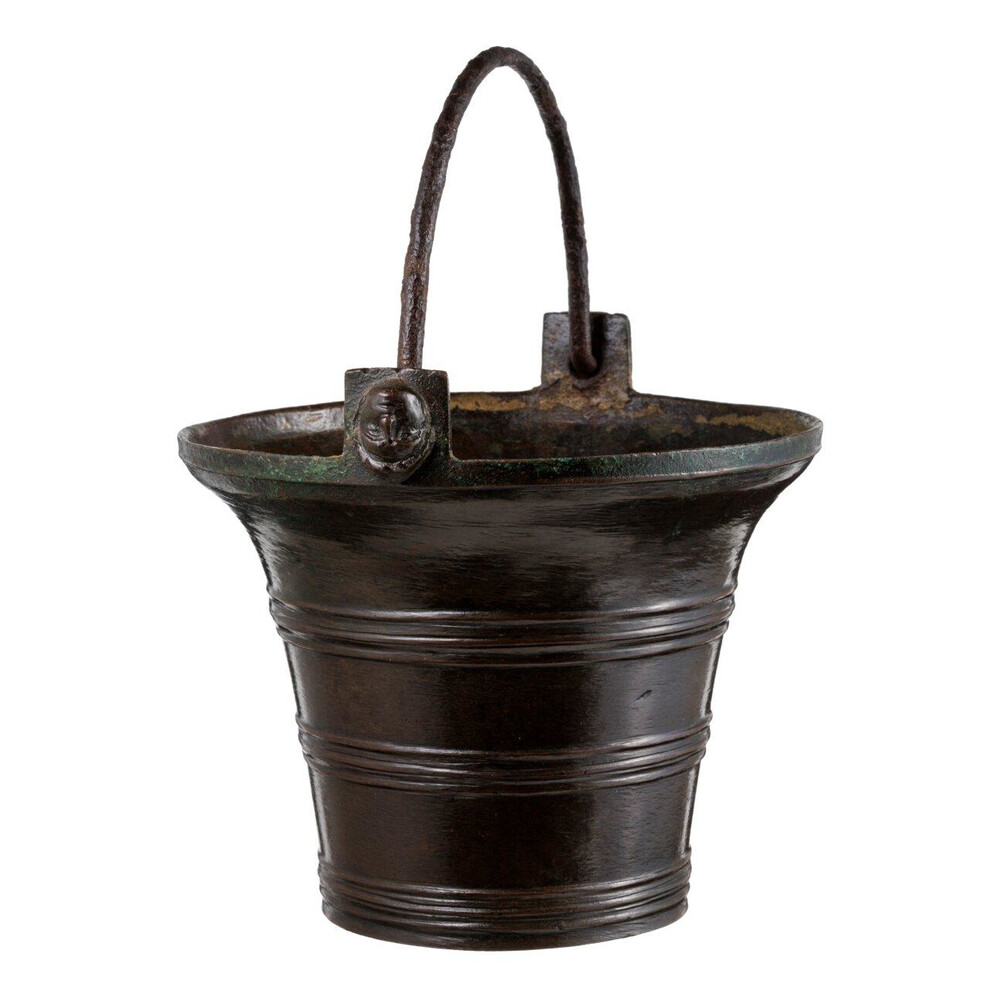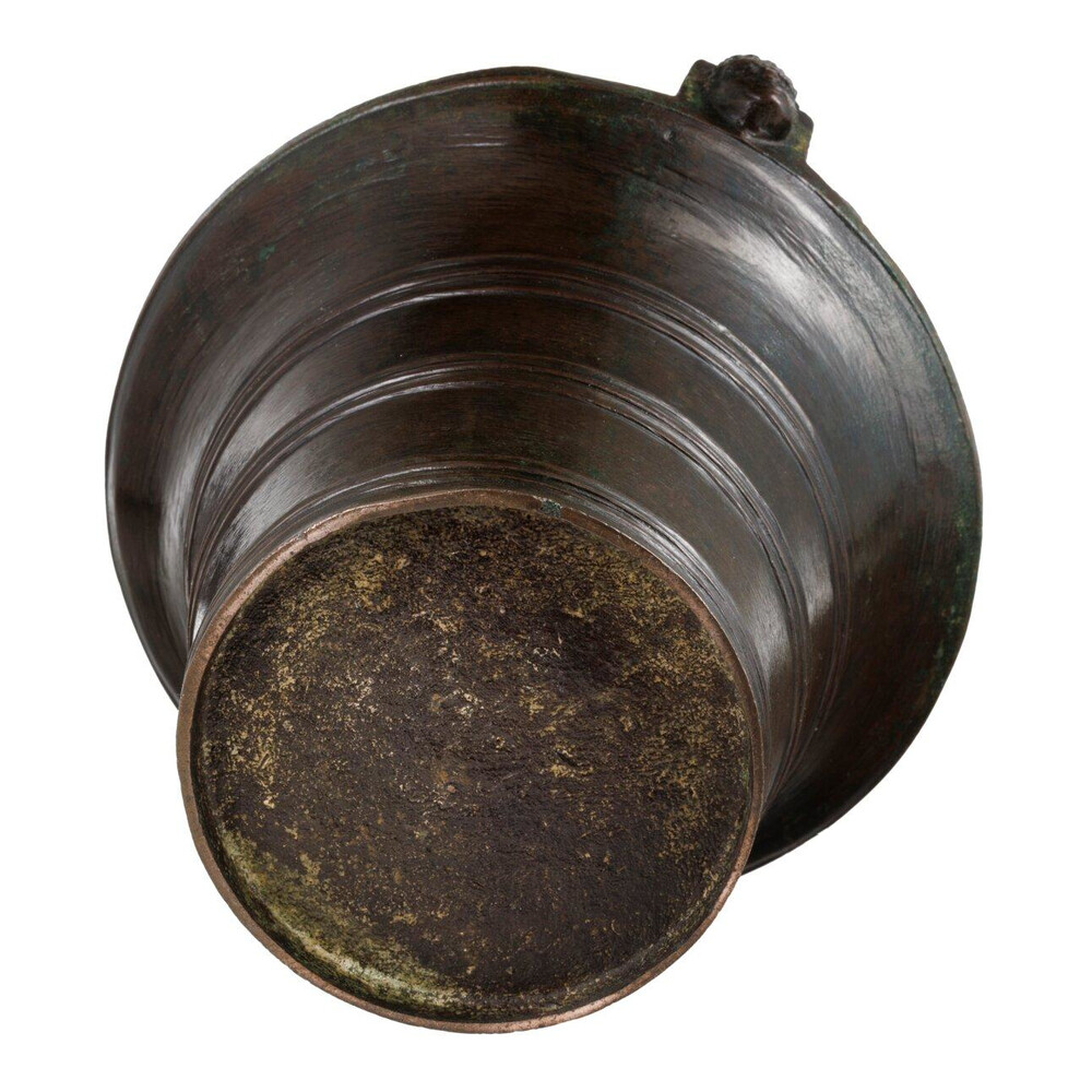 A polished bronze bell shaped holy water font, cast with several ornamental rings. With original iron handle, held by handle junctures (simultaneously cast with the body) decorated with monks’ heads.