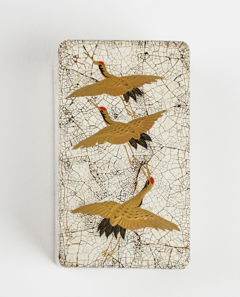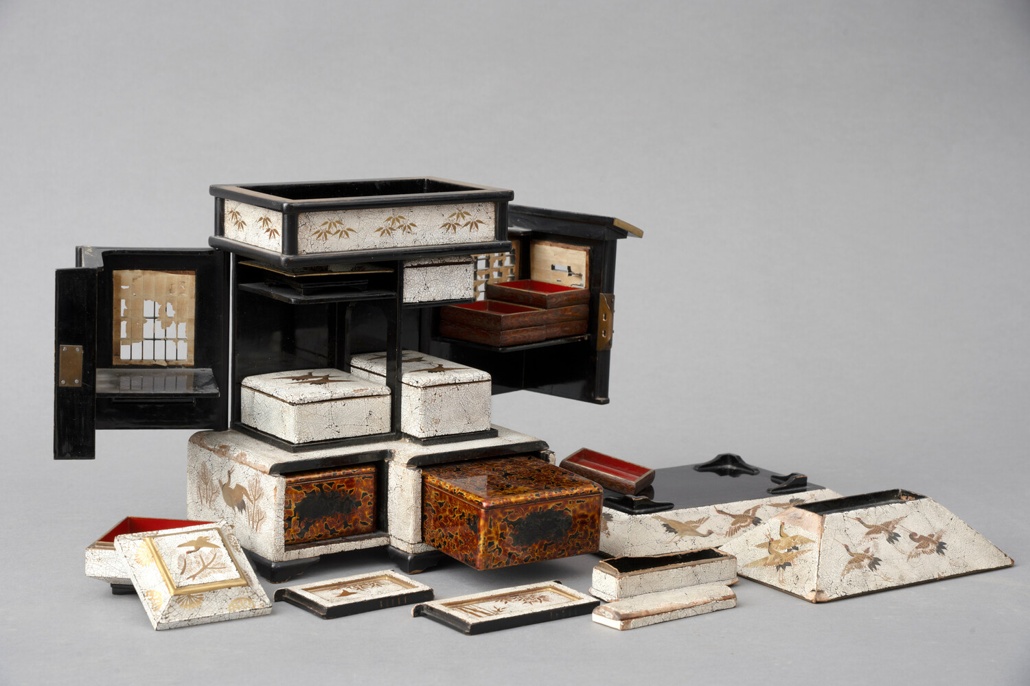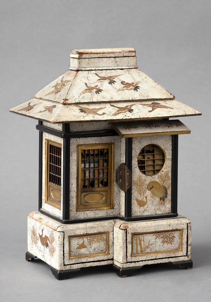 A rare miniature Japanese Tea House in rankanku or eggshell lacquer with a decor of gold cranes.
