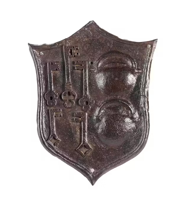 In the shape of a coat of arms, forged in iron, with a rim. Riveted to it are five examples of keys and two iron kettles with handles. Holes at the corners and top center indicate the former attachment to the workshop door or house.
